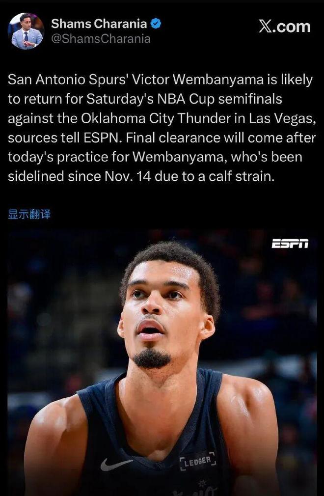 爆料王Shams:文班亚马将在NBA杯半决赛对阵雷霆比赛中复出。不挑软柿子,要干就干联盟第一,非常硬气。